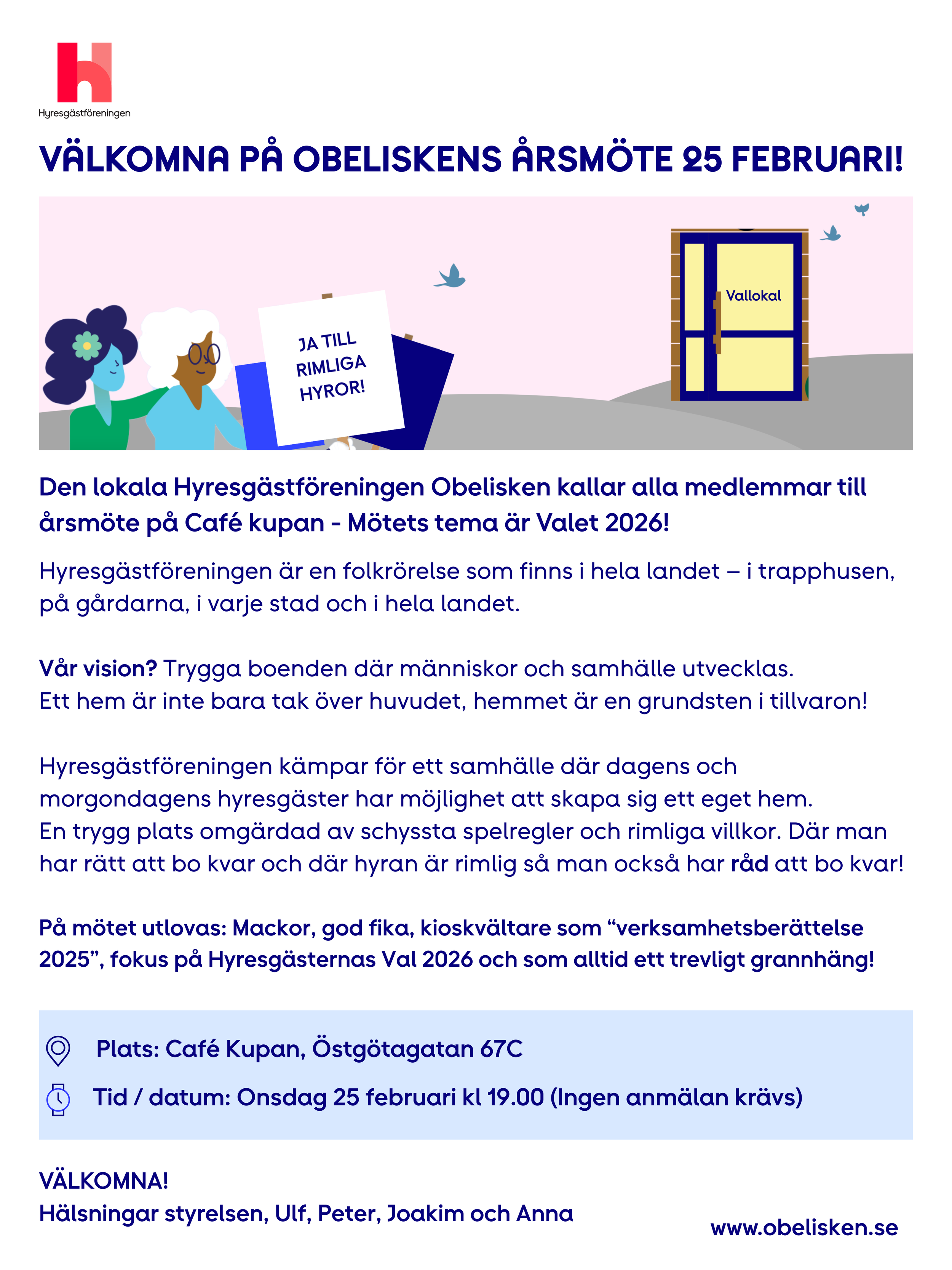 Hyresgästföreningen Obelisken kallar alla medlemmar till årsmöte.